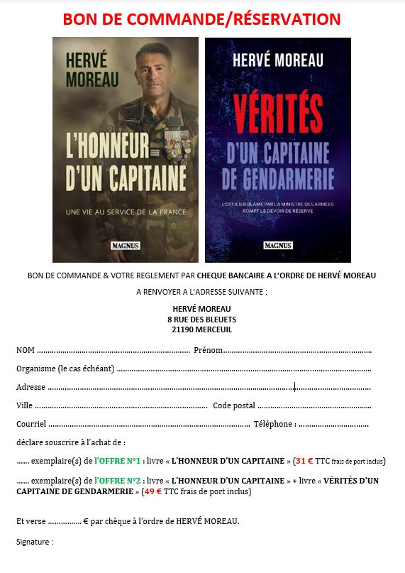 Pour toute question concernant le livre, demander une dédicace de l'auteur, s'informer sur les conditions d'expédition, envoyez un mail à capitainehervemoreau21@gmail.com